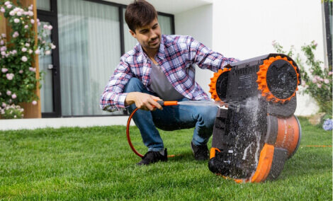 Препоръка: Не мийте косачката робот с водоструйка, маркуч, струйник или други подобни методи! Препоръчваме ви, когато я почиствате, да я забърсвате с влажен парцал и да изчетквате засъхналата трева и мръсотия с четка!