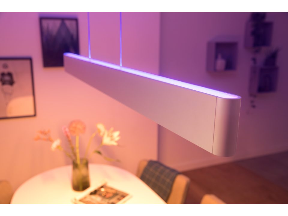 Hue Ensis е подходящ за пространства като трапезария или всекидневна, като включва два LED източника на светлина, които работят със светлинния спектър White и Color Ambiance при обща консумация от 79W, което означава, че можете да се насладите на над 50 000 нюанса на бяла светлина, от топла до студена и 16 милиона живи цвята. От приложението Philips Hue можете също да изберете един от светлинните сценарии от галерията Hue или да създадете свой собствен сценарий, като изберете от цветовата палитра или дори от вашата лична фотогалерия. Пенделът Hue Ensis е предназначен за големи пространства със светлинен поток от 4750Lm, силна и ярка светлина.